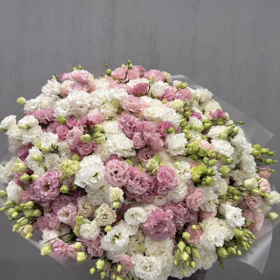На фото букет из 101 эустомы розового и белого цвета. В составе: эустома (лизиантус) 101 шт, дизайнерская упаковка 5 шт, атласная лента 1 шт, . Все цветы свежие и ароматные, букет красиво оформлен и отлично подходит для подарка. Доступна доставка цветов или самовывоз.
