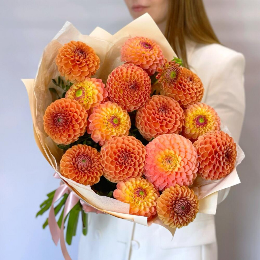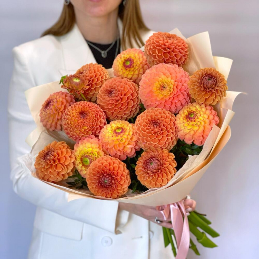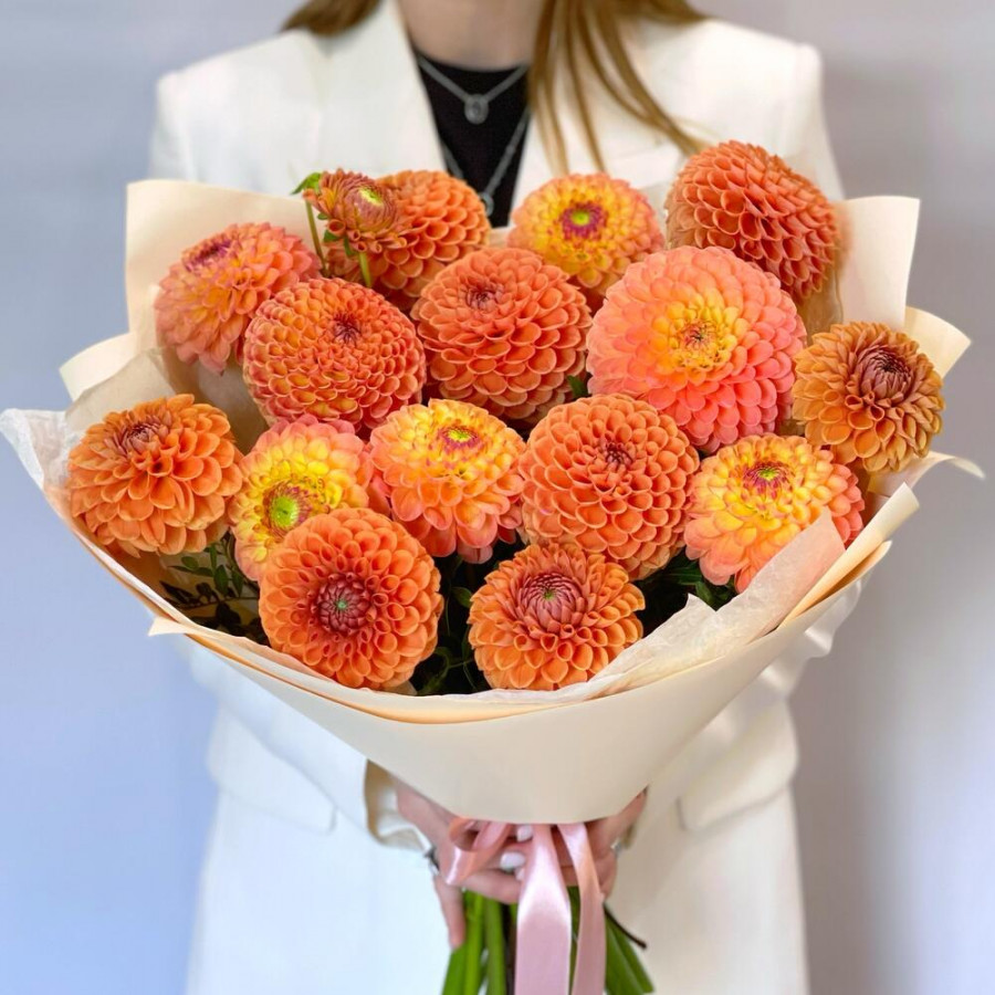 На фото монобукет из 15 оранжевых георгин. В составе: георгина 15 шт, писташ 3 шт, дизайнерская упаковка 1 шт, атласная лента 1 шт, . Все цветы свежие и ароматные, букет красиво оформлен и отлично подходит для подарка. Доступна доставка цветов или самовывоз.