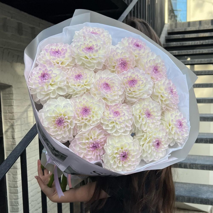На фото букет из 19 бело-лиловых георгин. В составе: георгина 19 шт, дизайнерская упаковка 1 шт, атласная лента 1 шт, . Все цветы свежие и ароматные, букет красиво оформлен и отлично подходит для подарка. Доступна доставка цветов или самовывоз.