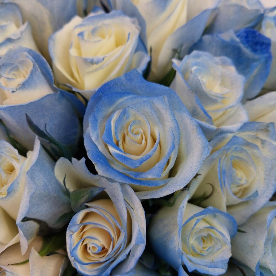 На фото букет из 41 голубой розы. В составе: роза 41 шт, дизайнерская упаковка 1 шт, атласная лента 1 шт, . Все цветы свежие и ароматные, букет красиво оформлен и отлично подходит для подарка. Доступна доставка цветов или самовывоз.