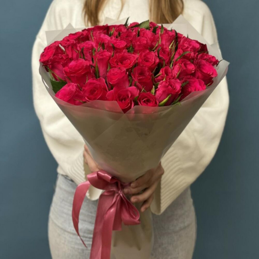 На фото букет из 41 малиновой розы. В составе: роза 41 шт, дизайнерская упаковка 2 шт, атласная лента 1 шт, . Все цветы свежие и ароматные, букет красиво оформлен и отлично подходит для подарка. Доступна доставка цветов или самовывоз.