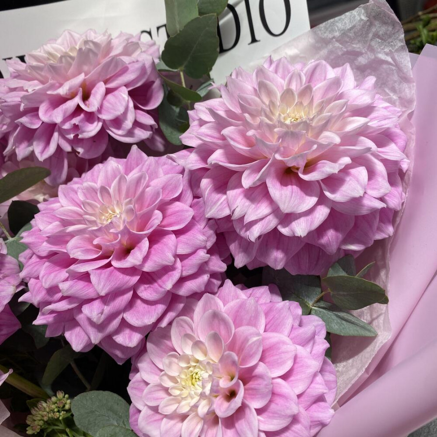 На фото букет из 7 розовых георгин. В составе: георгина 7 шт, эвкалипт 3 шт, дизайнерская упаковка 1 шт, атласная лента 1 шт, . Все цветы свежие и ароматные, букет красиво оформлен и отлично подходит для подарка. Доступна доставка цветов или самовывоз.
