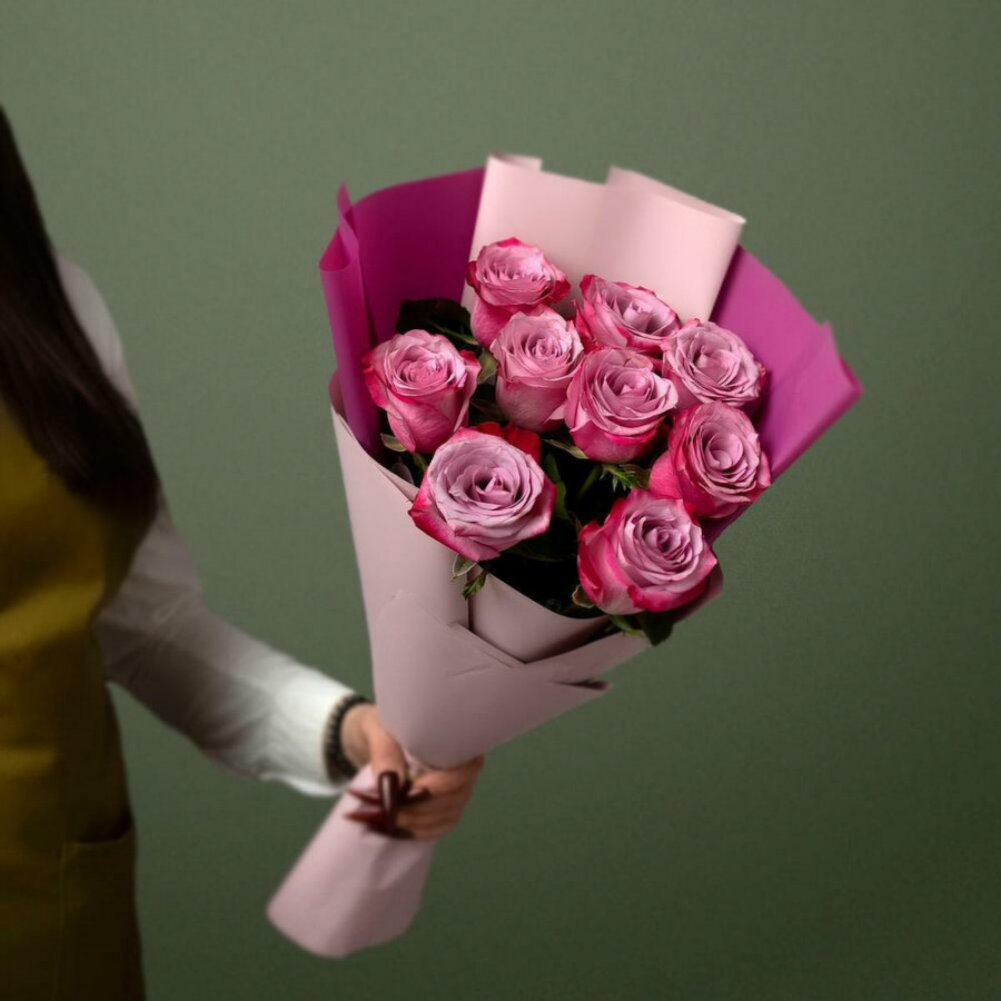 На фото букет из 9 фиолетовых роз. В составе: роза 9 шт, дизайнерская упаковка 2 шт, атласная лента 1 шт, . Все цветы свежие и ароматные, букет красиво оформлен и отлично подходит для подарка. Доступна доставка цветов или самовывоз.