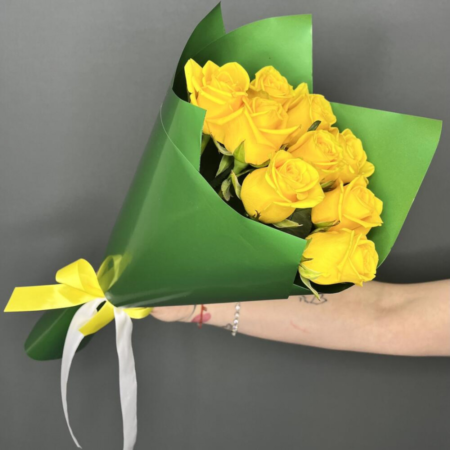 На фото букет из 9 желтых роз. В составе: роза 9 шт, дизайнерская упаковка 1 шт, атласная лента 1 шт, . Все цветы свежие и ароматные, букет красиво оформлен и отлично подходит для подарка. Доступна доставка цветов или самовывоз.
