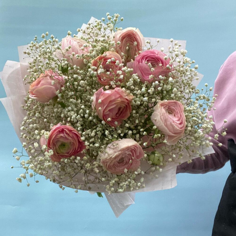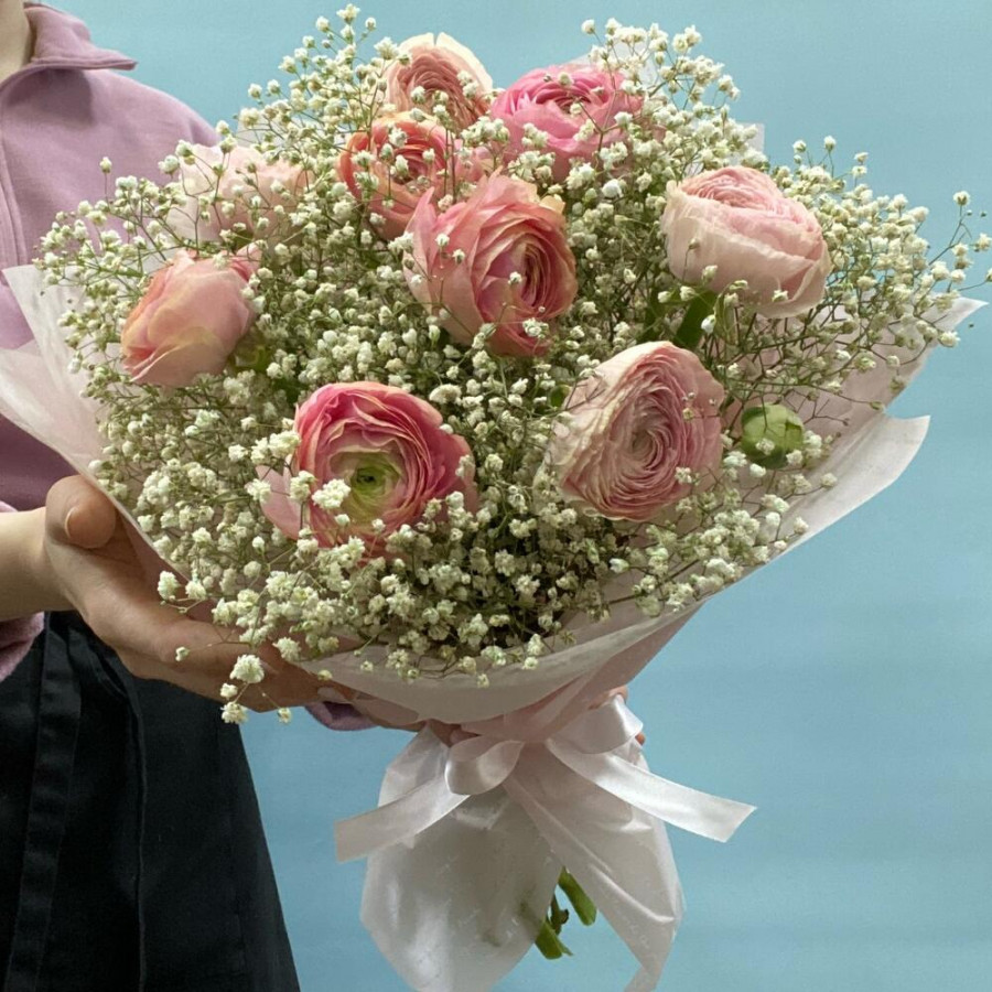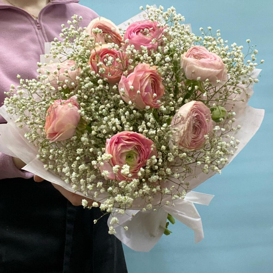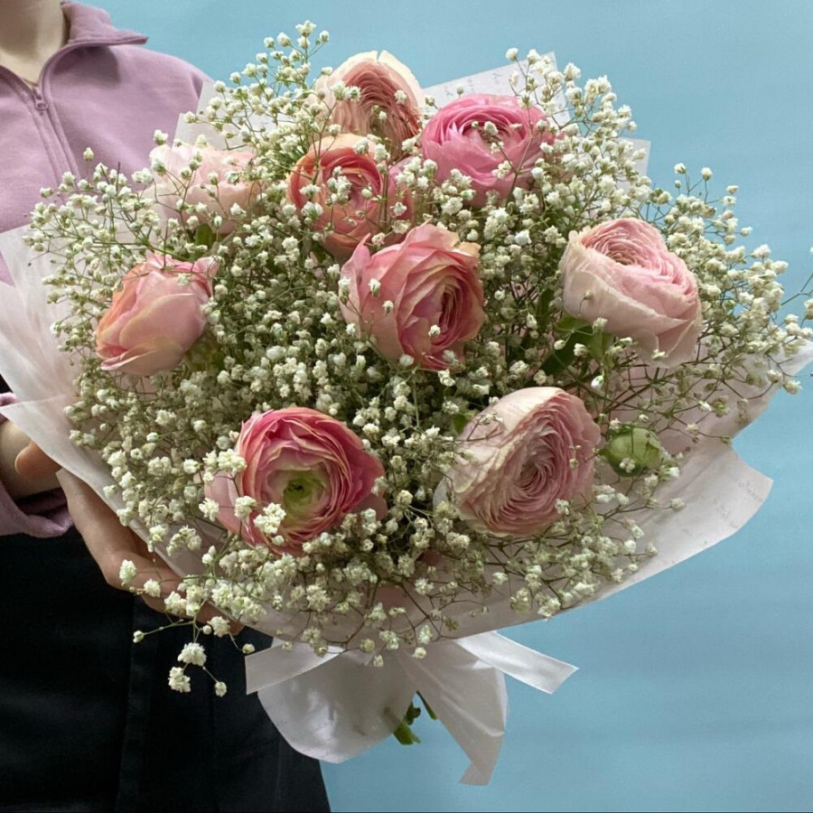 Букет из розовых ранункулюсов с белой гипсофилой в Шадринске