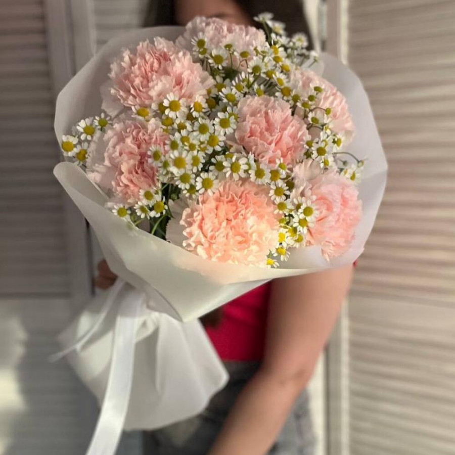 На фото букет «розовый пломбир». В составе: гвоздика 7 шт, танацетум 5 шт, дизайнерская упаковка 1 шт, атласная лента 1 шт, . Все цветы свежие и ароматные, букет красиво оформлен и отлично подходит для подарка. Доступна доставка цветов или самовывоз.